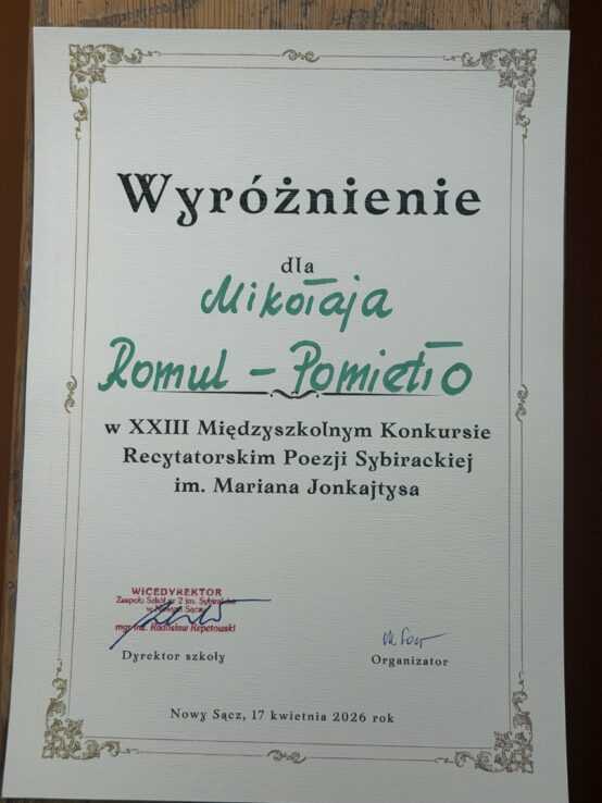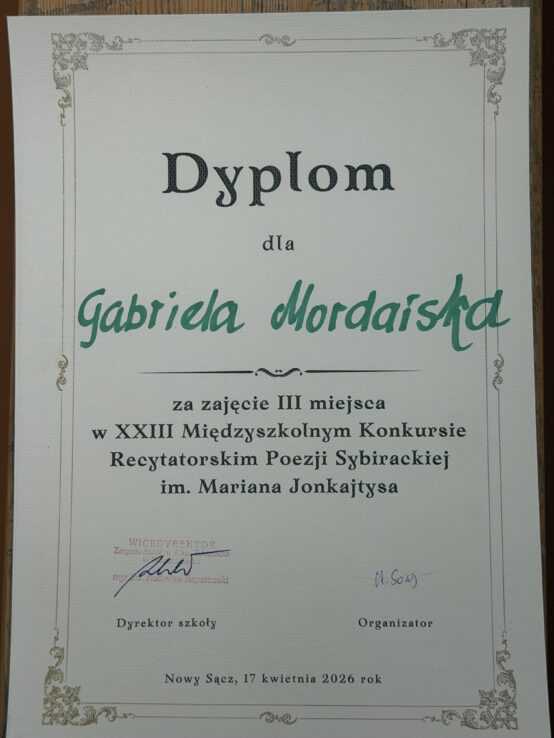 Dnia 17 kwietnia 2026 r. w Zespole Szkół Nr 2 im. Sybiraków odbył się XXIII Międzyszkolny Konkurs Recytatorski Poezji Sybirackiej im. Mariana Jonkajtysa, w którym udział wzięli uczniowie szkół z Nowego Sącza oraz całego powiatu.