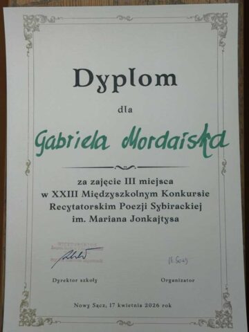 Udział w konkursie był nie tylko okazją do rozwijania talentów recytatorskich, ale przede wszystkim ważną lekcją historii i empatii. Spotkanie z poezją sybiracką stało się dla młodych ludzi momentem głębokiej refleksji nad losem tych, którzy doświadczyli tragicznych wydarzeń zesłania, a także świadectwem pamięci, którą należy pielęgnować i przekazywać kolejnym pokoleniom.